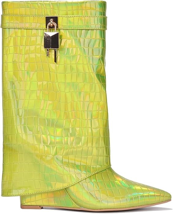 Cape Robbin Women's Fold Over Padlock Mid Calf Wedge Heel Pointed Toe Pull-On Boots Booties