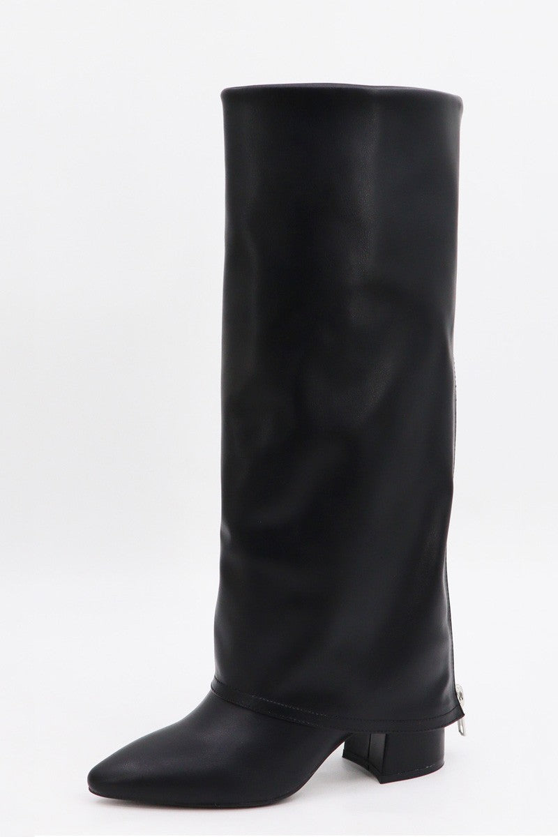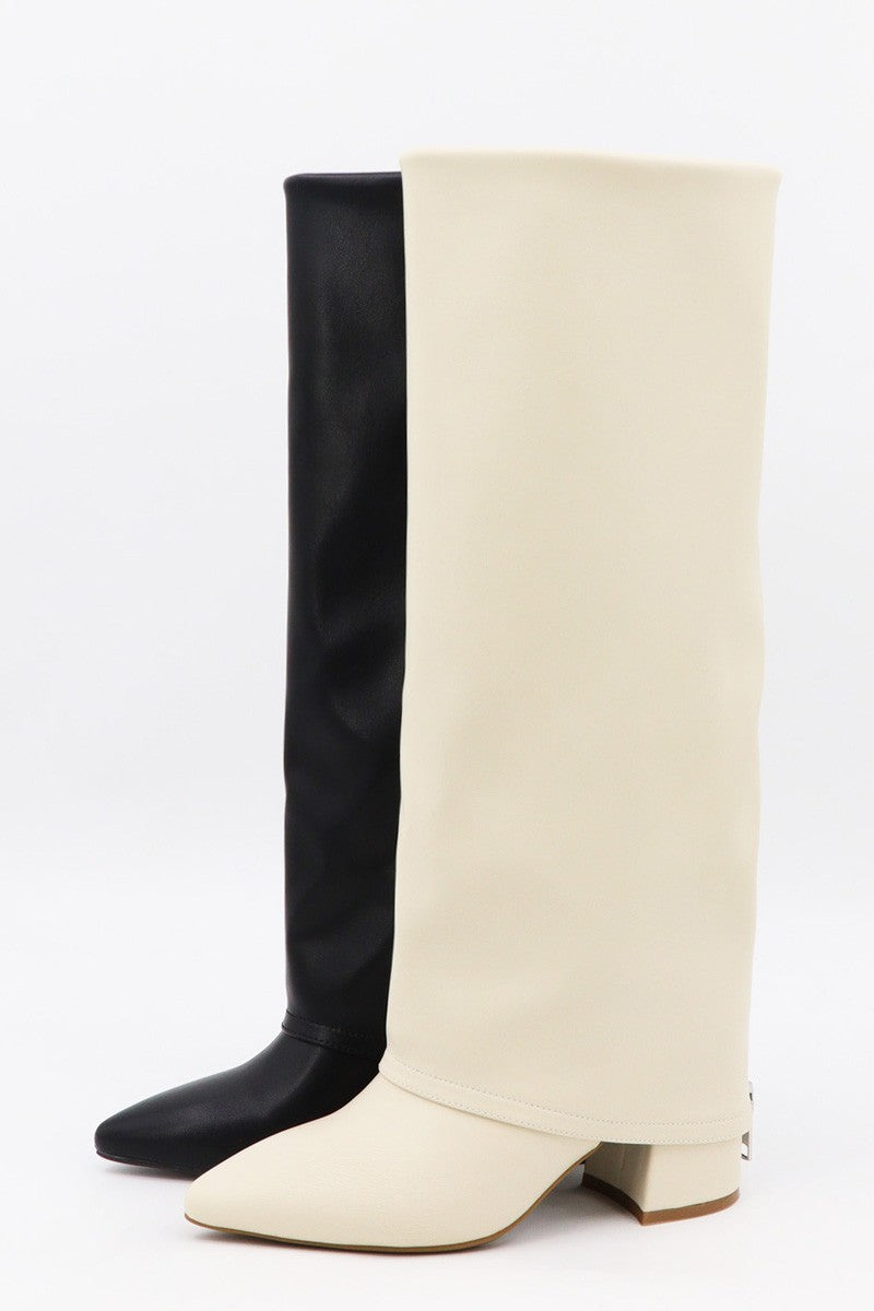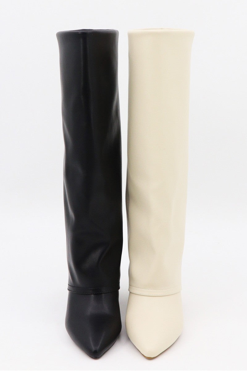 Women's, Pointed Toe, Foldover, Knee High Boots -Material: Synthetic Leather -Foldover, Knee High Boots -Beige Crinkle PU, Black Crinkle PU - Size: 12 pairs
