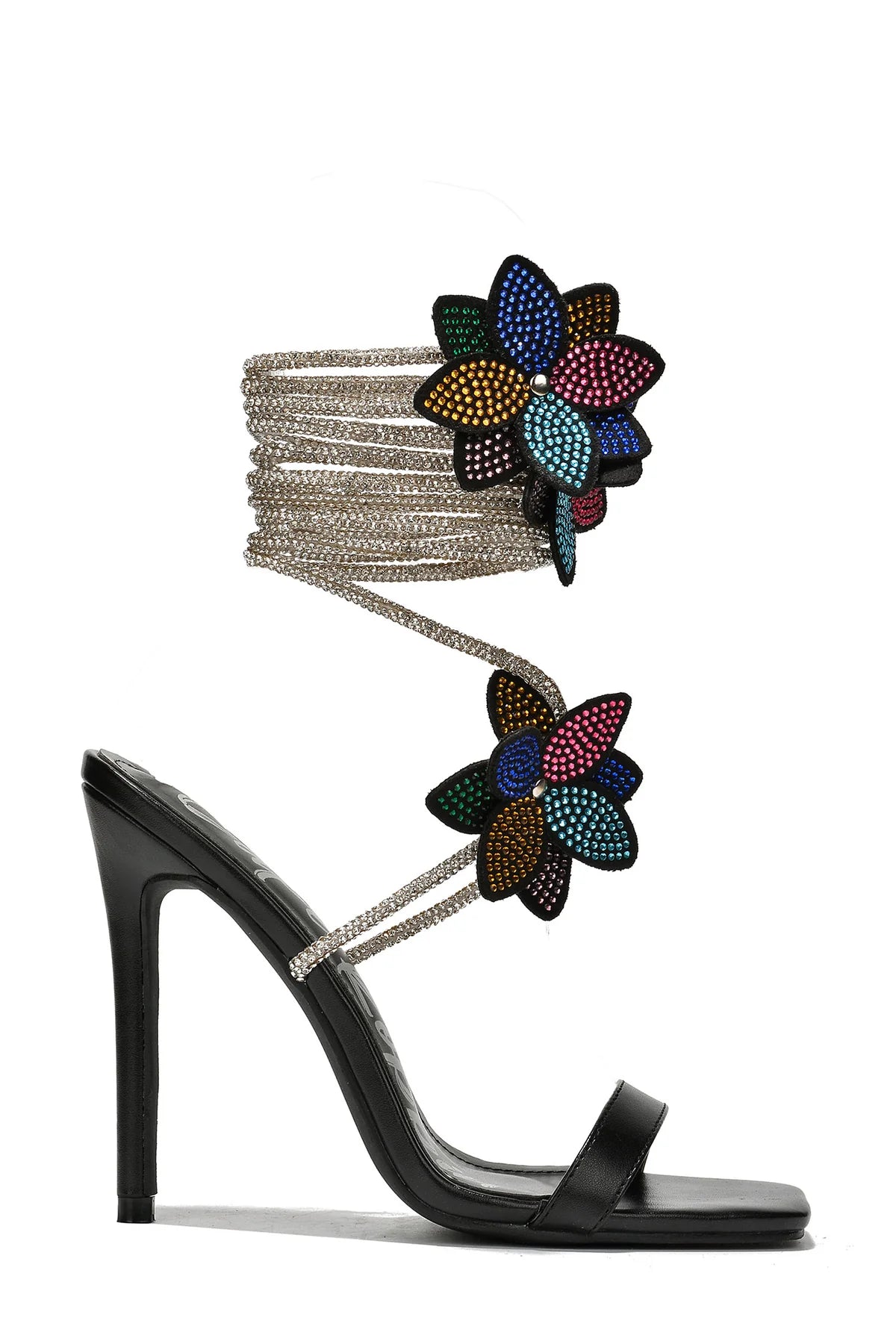 These high heels with flower trims and rhinestone rope will make you feel like star! Flowery will be the perfect addition to any outfit and will be sure to turn heads.