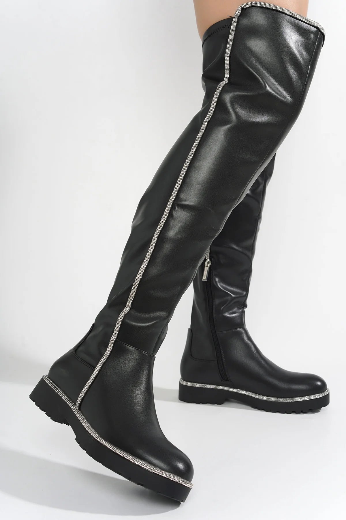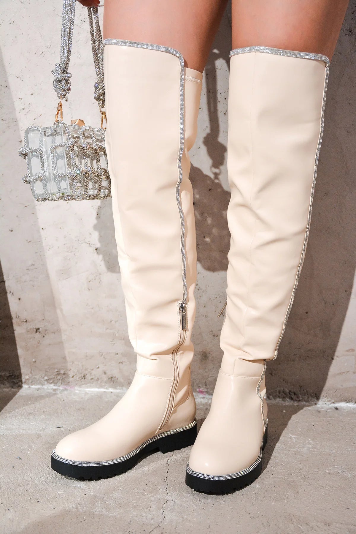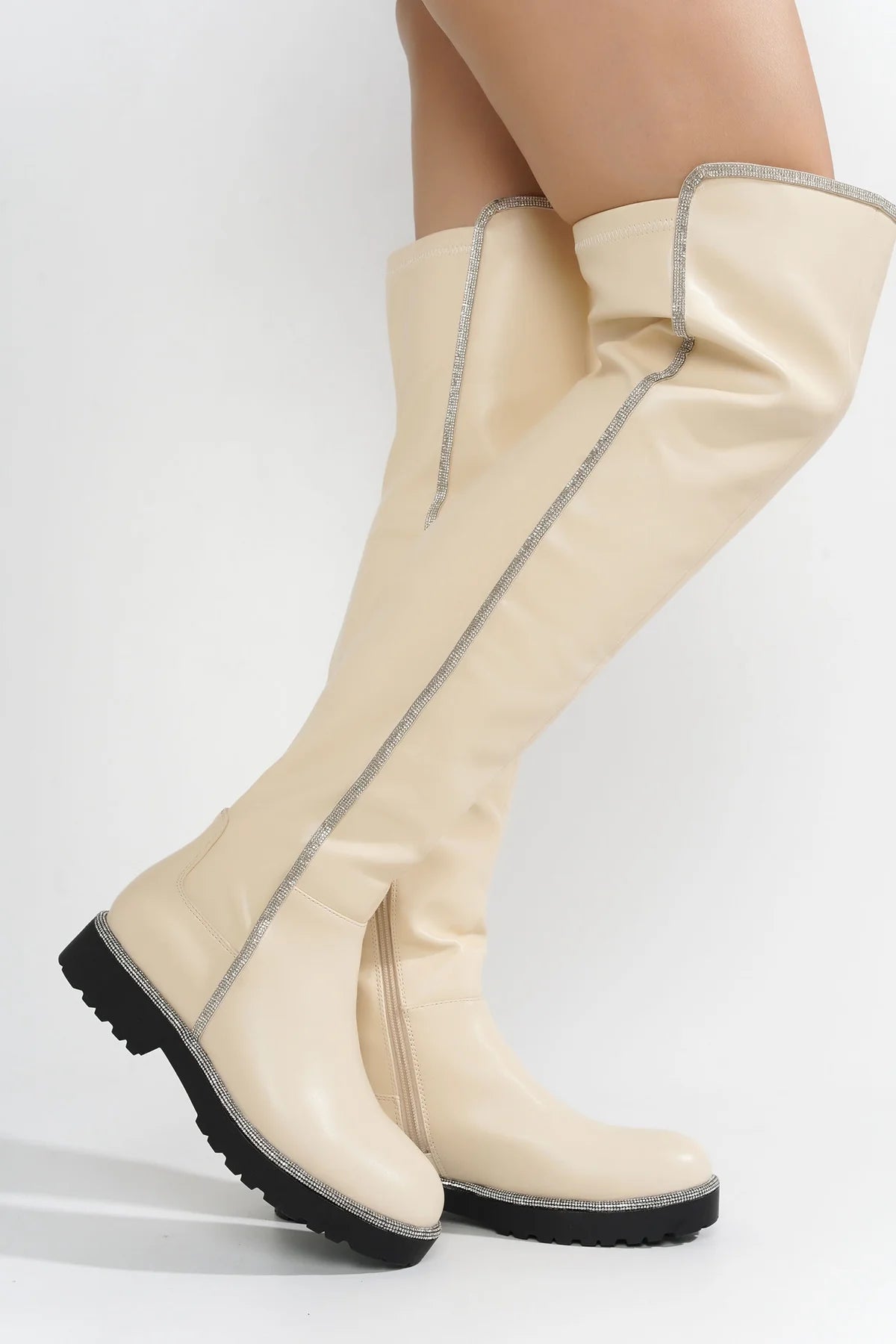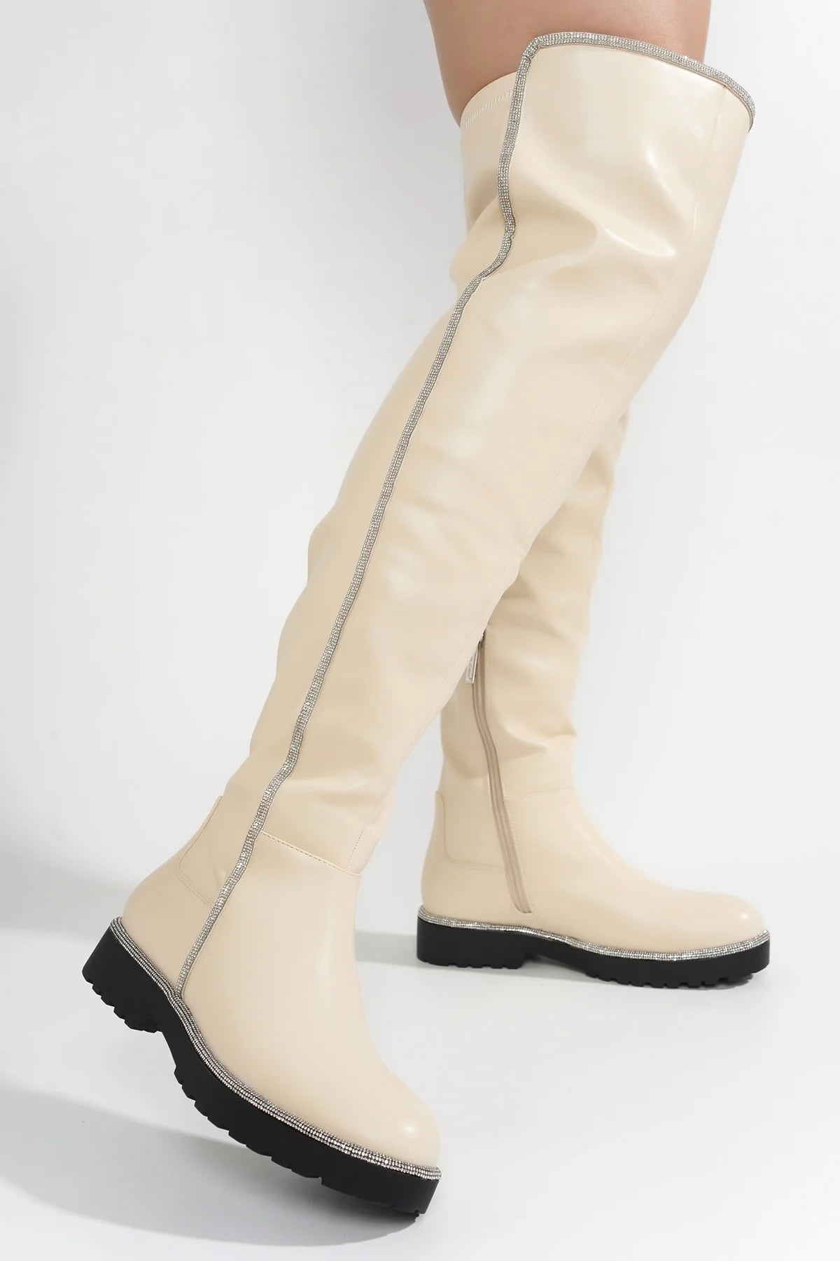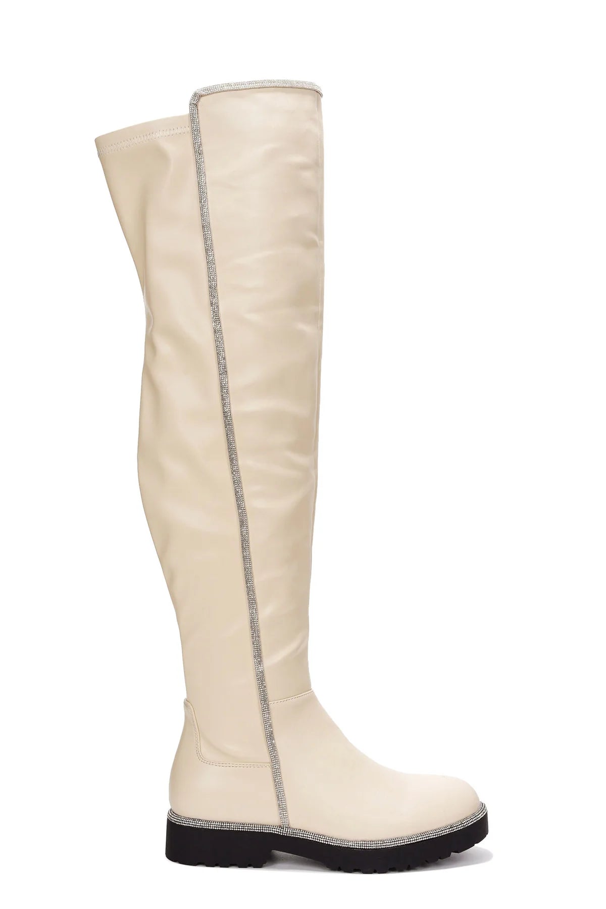 Cape Robbin's Kuri is a show-stopper! Features a thigh-high silhouette and sparkly rhinestone trim. These boots deliver a splash of glamour to any outfit!