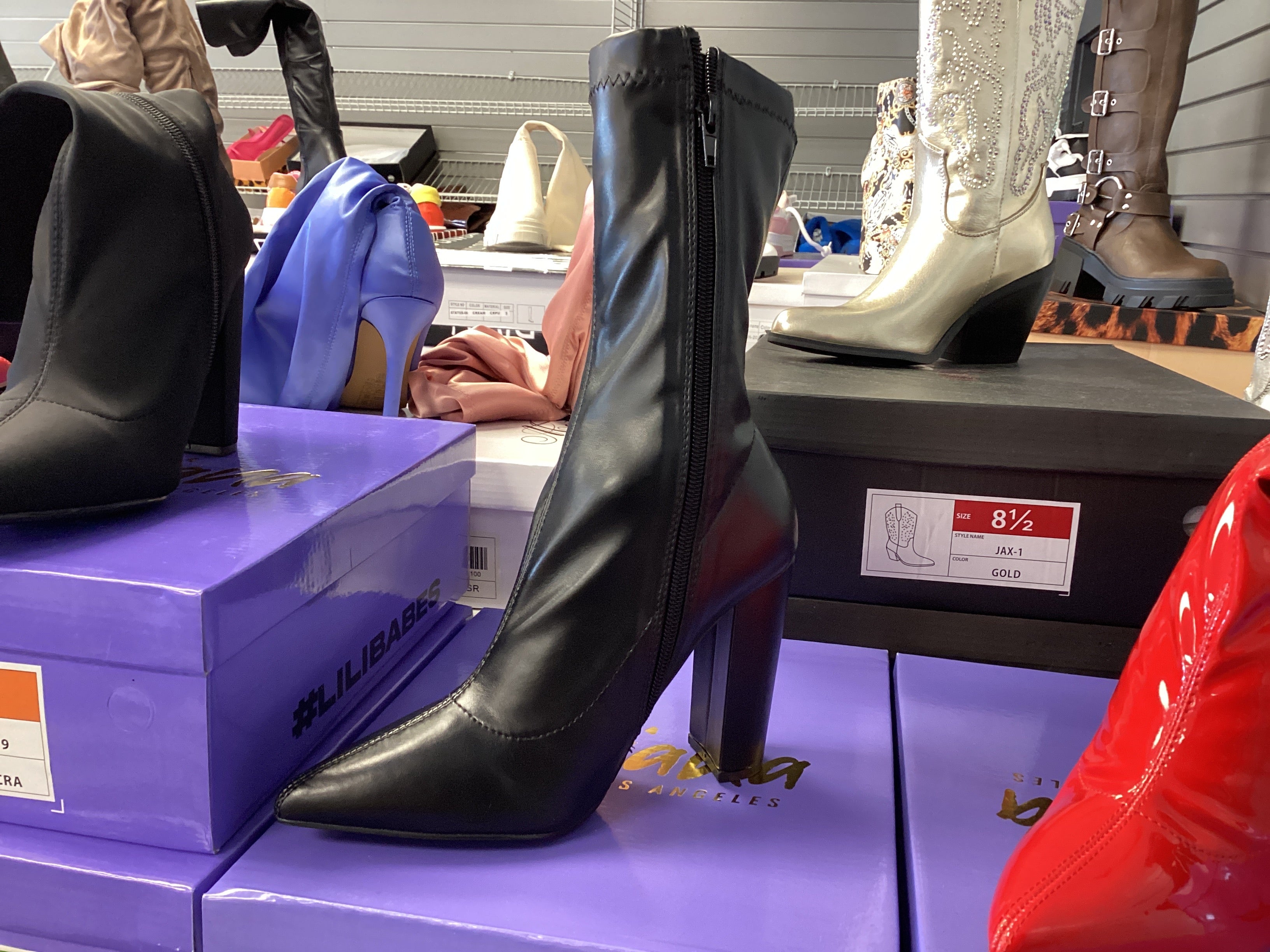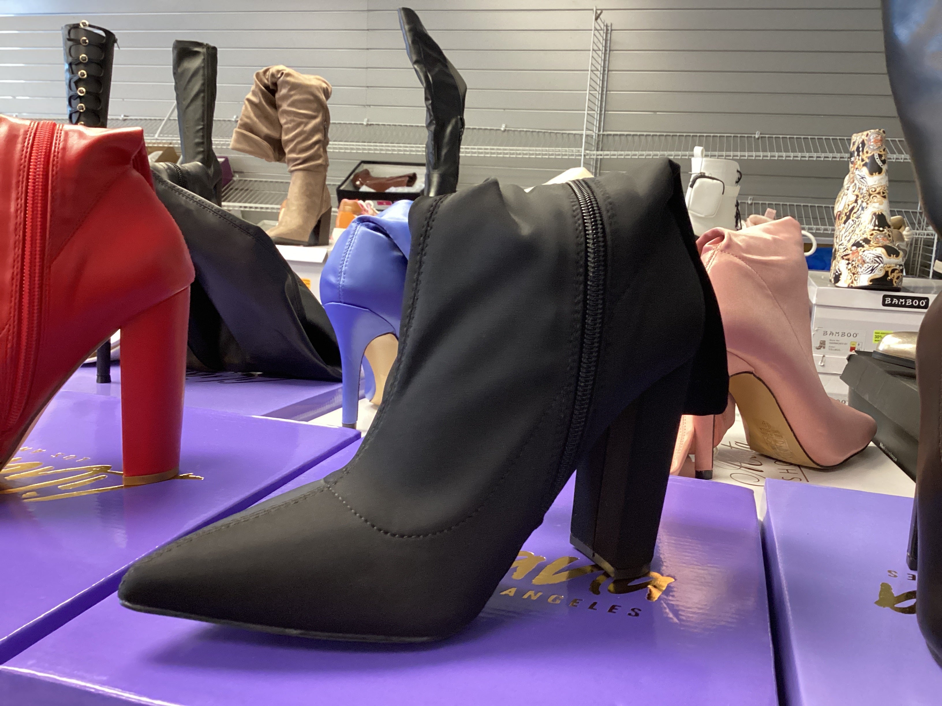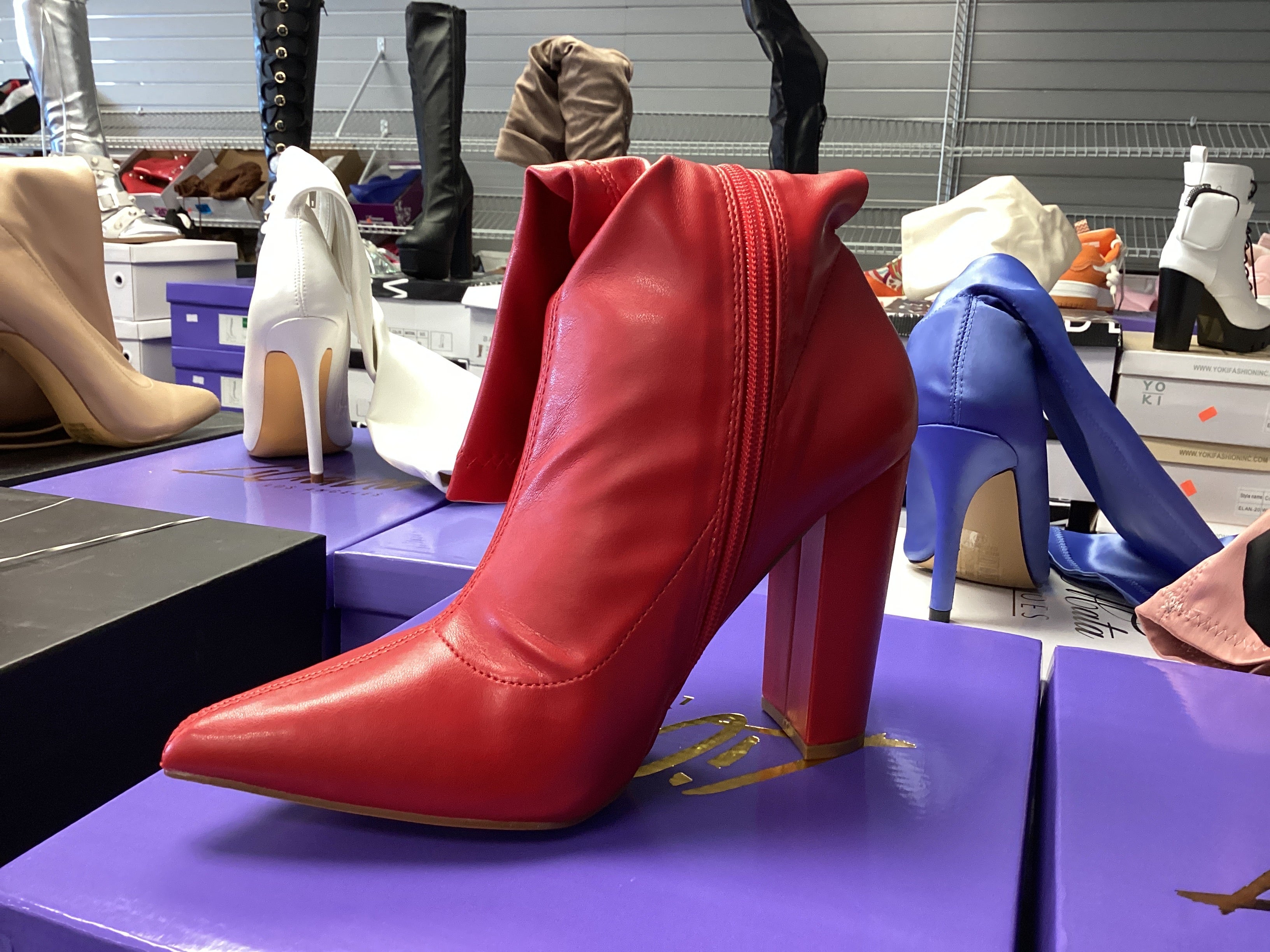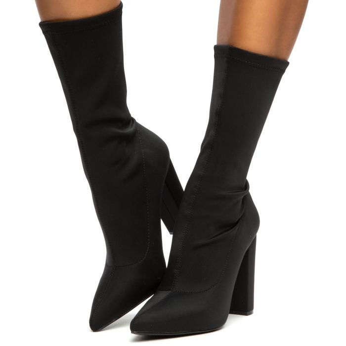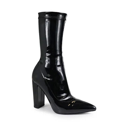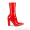 NORDIC-19 LATEX STRETCHY POINTED CHUNKY HEEL BOOTIE - RED BLACK PATENT BLACK PU
