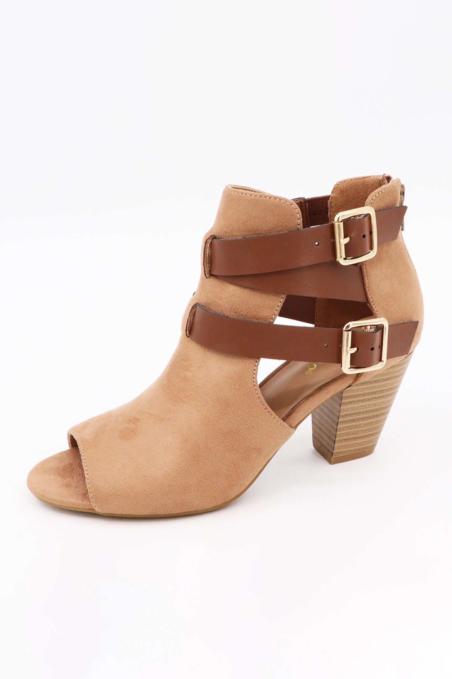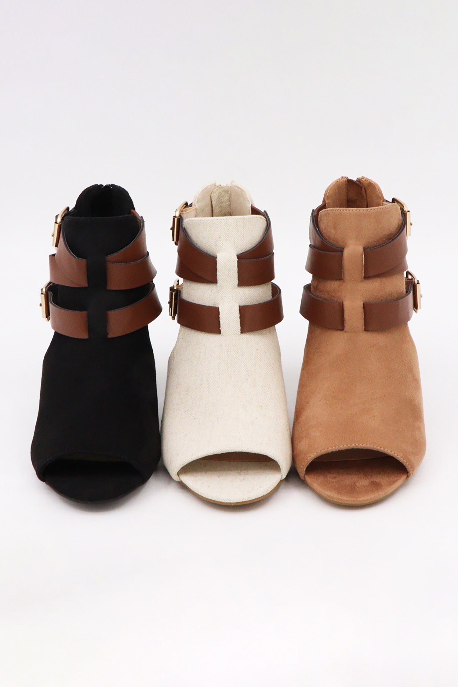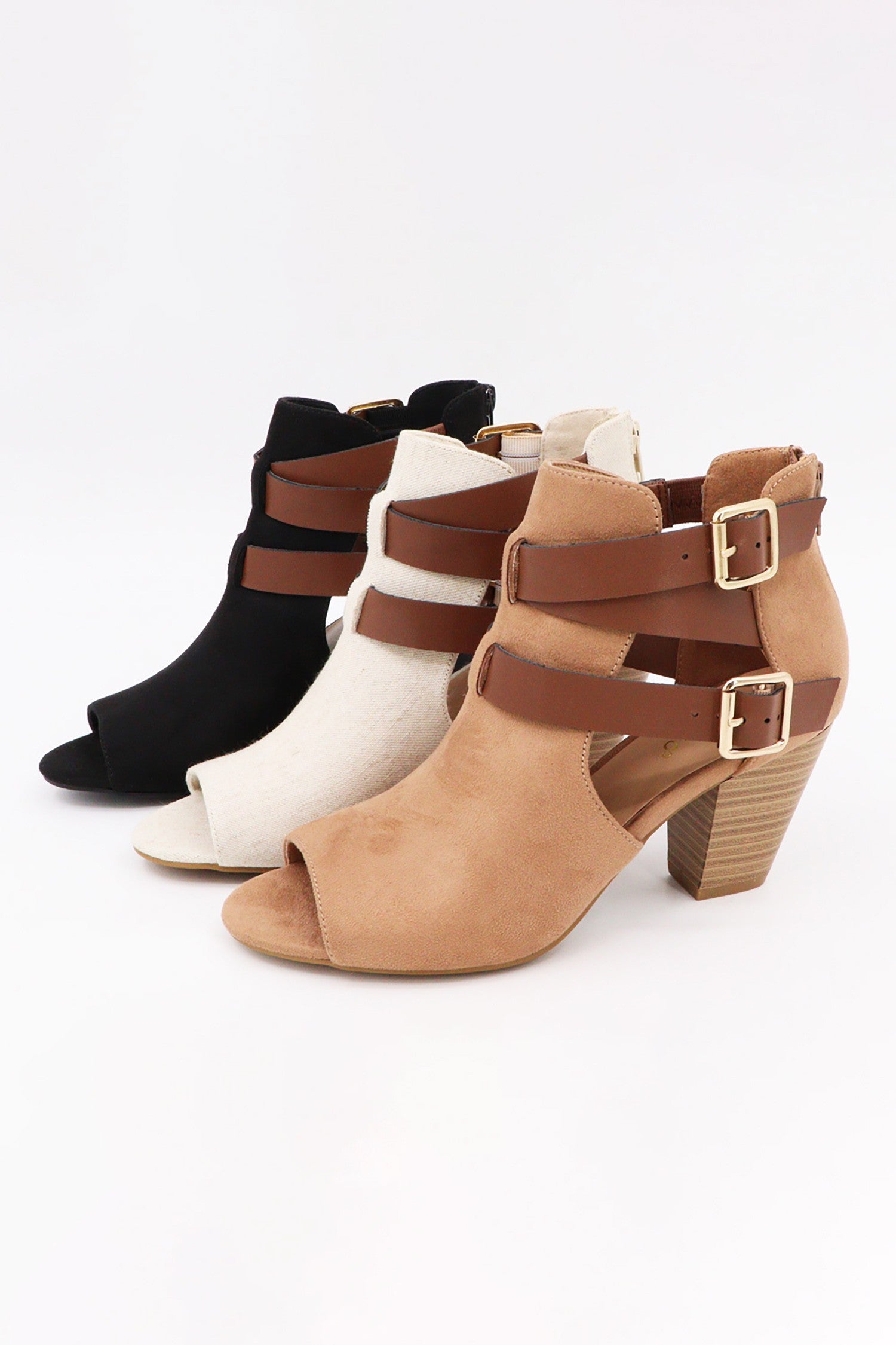 Women's, Open Toe, Side Cut Out, Ankle Strap, Booties -Rhinestone Embellished -Side Cut Out, Ankle Strap, Booties -Black Faux Suede, Camel Microfiber Suede, Natural Linen