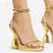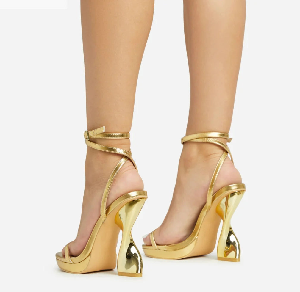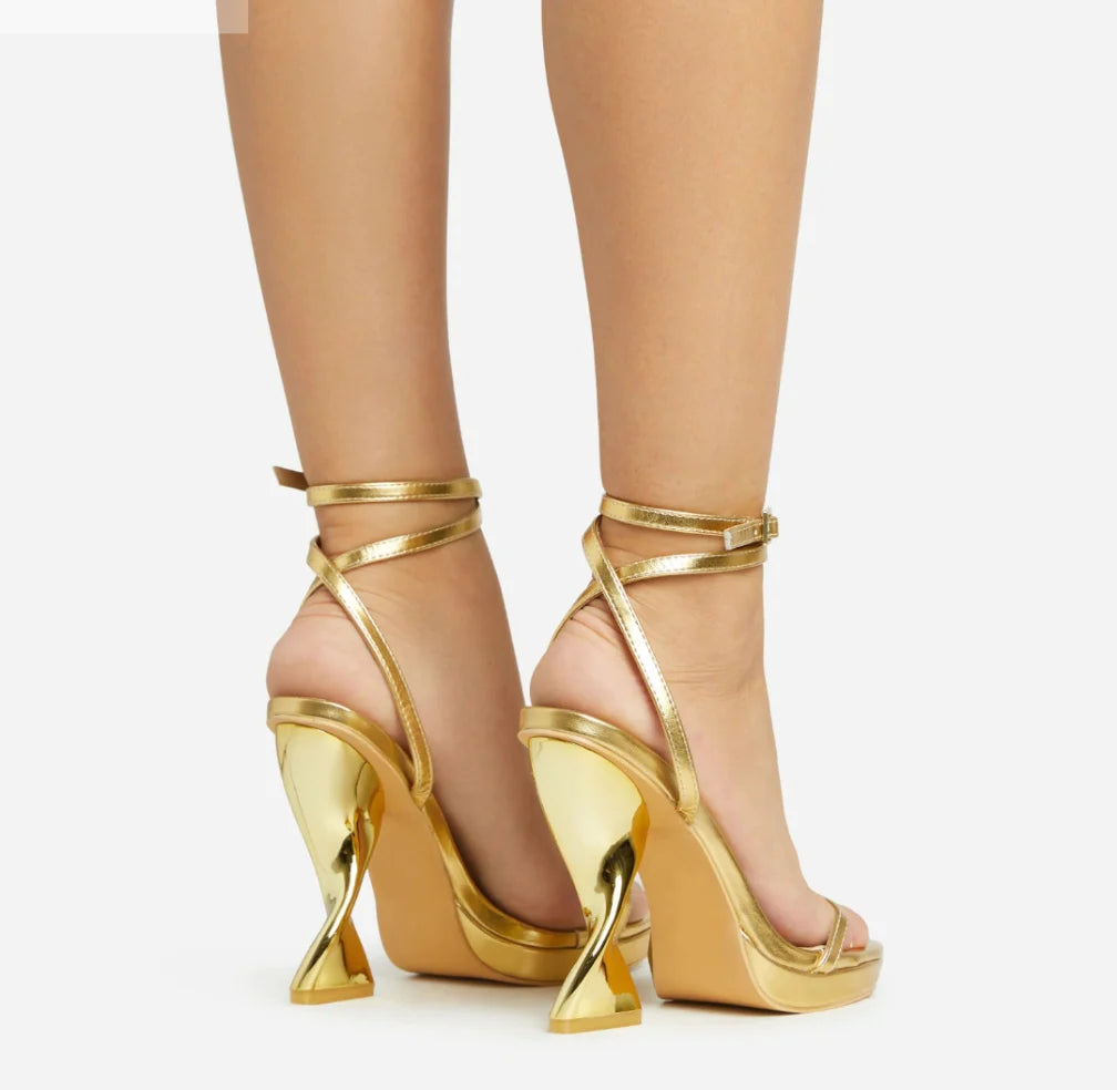 Girl, earn yourself some extra style points with these gorg heels. Featuring a gold metallic faux leather material, with a platform sole, an open toe and a twisted statement heel.
